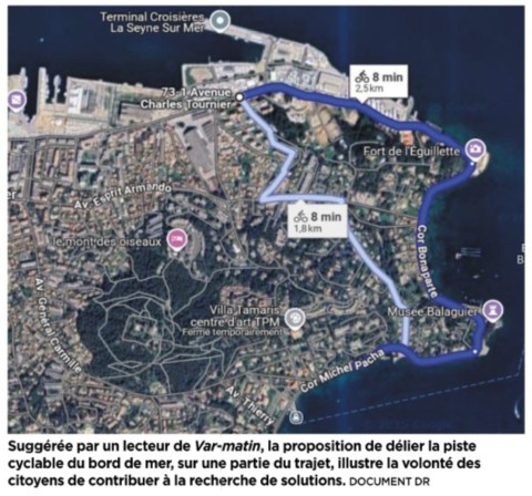 Par ailleurs, un administré a transmis à Var-matin une autre proposition pour franchir ce qu'il appelle la « zone critique », celle de la corniche Bonaparte. « Et si on déviait la piste cyclable pour conserver le double sens de circulation automobile ? », interroge-t-il. Ce lecteur propose ainsi de « détacher la piste cyclable du trajet côtier, pour emprunter le chemin du Manteau (trop étroit pour envisager une déviation pour les voitures) afin de rejoindre l'avenue de la Corse résistante (au niveau de la chapelle) puis la corniche Philippe Giovannini par la rue Charles-Tournier ou le chemin Jacques-Casanova ou elle pourra de nouveau longer les voies de circulation automobile ». Comme le montre l'illustration ci-dessus, la distance et le temps de parcours seraient peu ou prou les mêmes qu'en passant par la corniche.